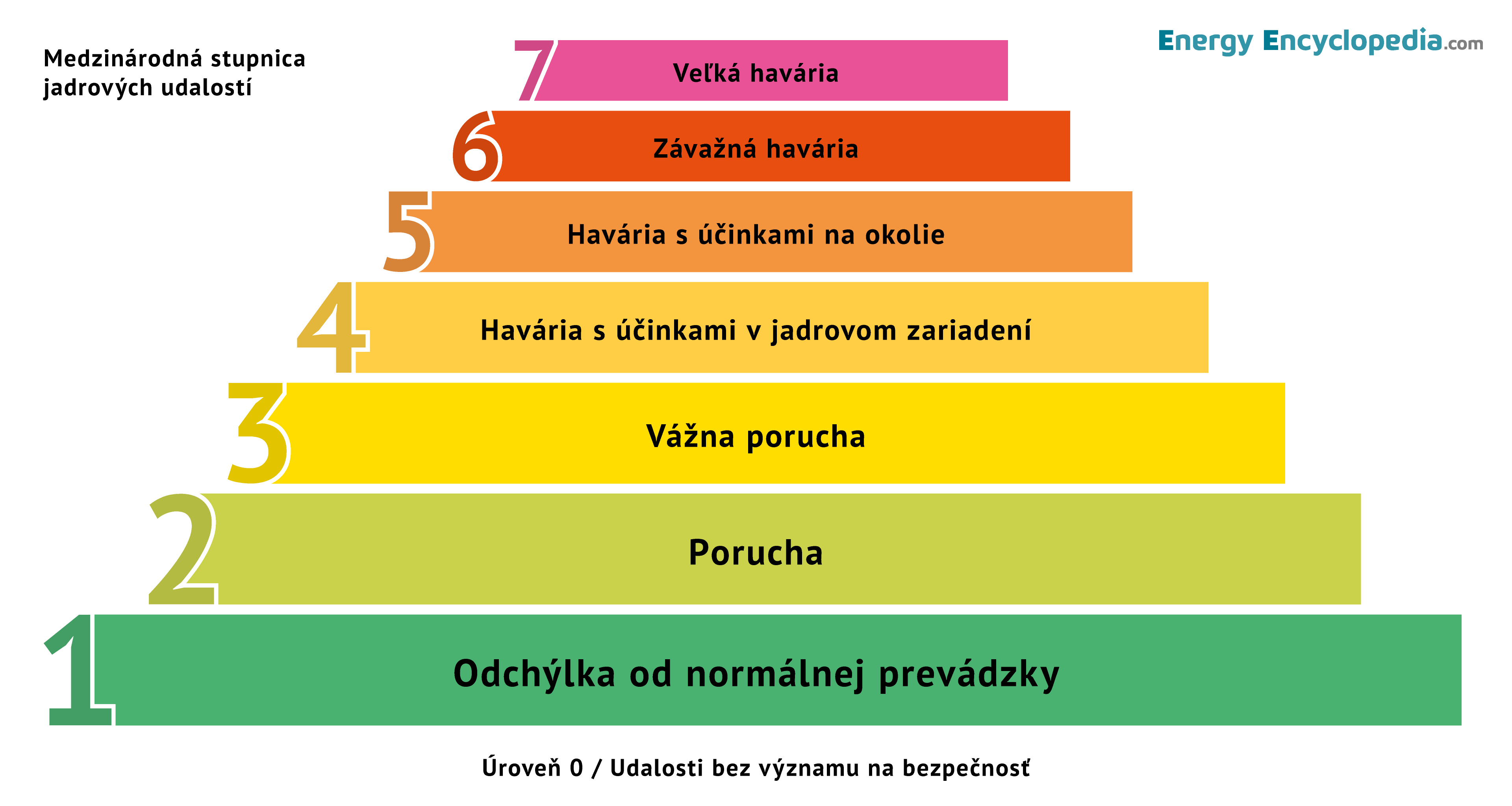 INES je rozdelená do 7 stupňov, pričom každá vyššia úroveň predstavuje približne desaťnásobne závažnejšiu udalosť než predchádzajúca. Stupne 1 až 3 predstavujú nehody, ktoré neohrozujú okolie a vonkajšie lokality elektrárne a nevyžadujú žiadne mimoriadne opatrenia. Stupne 4 až 7 sú havárie, ktoré už v dôsledku väčšieho úniku rádioaktivity do okolia vyžadujú realizovať opatrenia uvedené v prijatých havarijných plánoch. Udalosti bez významu pre jadrovú bezpečnosť sa klasifikujú pod stupnicou a označujú sa úrovňou 0 ako odchýlky od prevádzkových limitov.